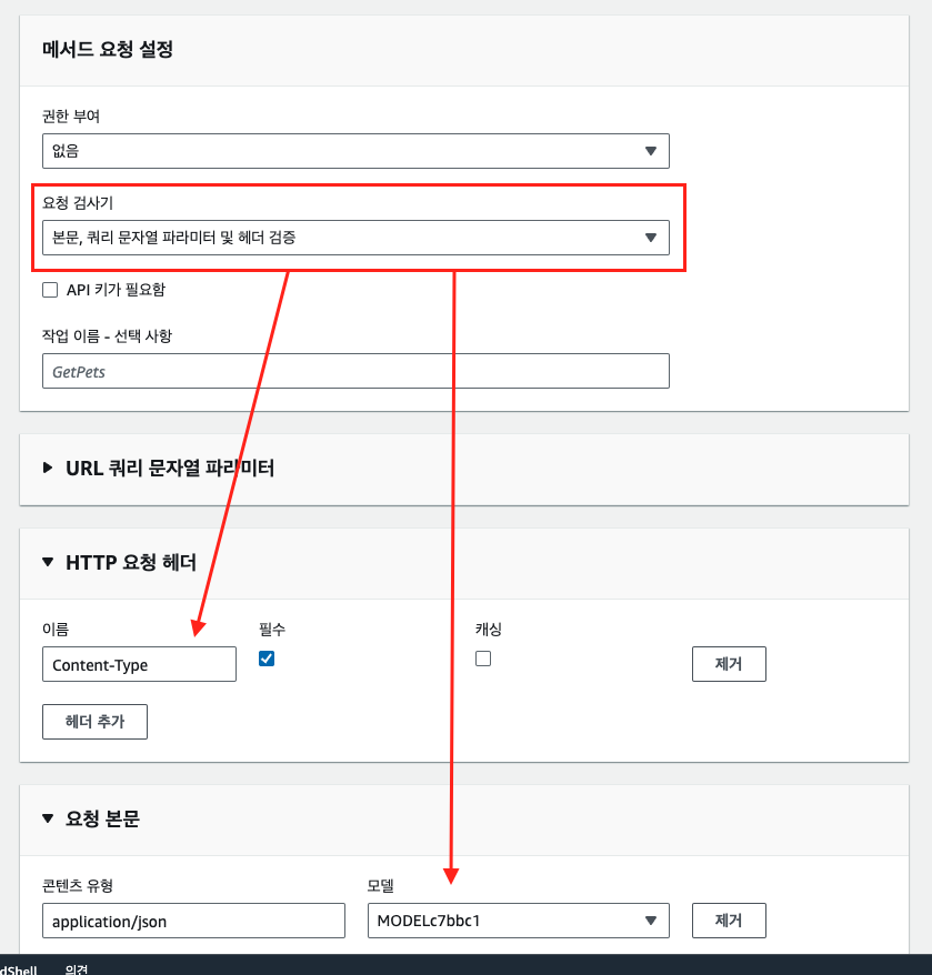 REST API는 메서드 요청 설정을 통해 요청 헤더와 본문에 대한 검증을 수행할 수 있다. 요청 검사기에 쿼리 문자열 파라미터 및 헤더 검증을 선택하고 아래와 같이 Content-Type 헤더 유무와 요청 페이로드에 대한 모델 스키마를 만들어서 지정할 수 있다. REST API에 대한 데이터 모델은 JSON 스키마 드래프트 4로 정의할 수 있다.