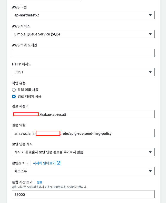 로 변경하고 매핑 템플릿에 SendMessage와 MessageBody를 구성하여 SQS 메시지로 전달되도록 설정해야한다.