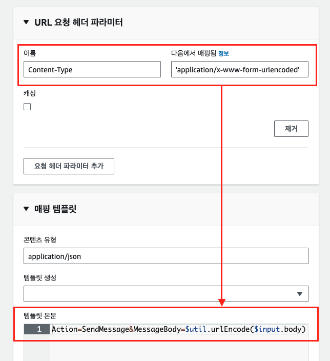 REST API의 통합 요청 설정에서는 콜백 결과로 포함되는 요청 페이로드를 SQS 메시지로 전달할 수 있도록 Content-Type: application/x-www-form-urlencoded