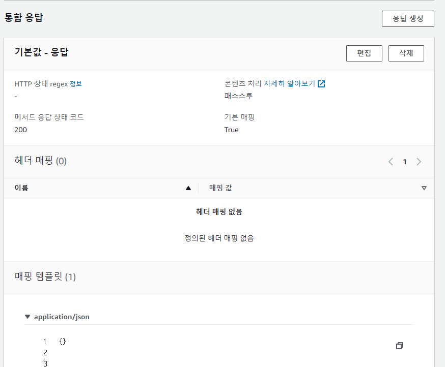 통합 응답 설정이 반드시 필요하지는 않지만 SQS 메시지 등록 시 전달되는 결과를 응답하지 않도록 설정할 수 있다. 비즈뿌리오에서 알림톡 발송 결과를 콜백으로 전달해줄때 응답 페이로드를 확인하지 않을것이므로 아래와 같이 빈 응답으로 변경할 수 있다. 만약, 빈 응답으로 변경하고 싶다면 통합 응답을 설정하기 이전에 메서드 응답에 200에 대한 상태 코드를 추가해야한다.