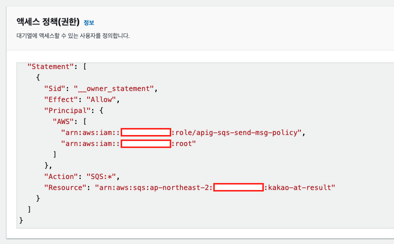 {"Error":{"Code":"AccessDenied","Message":"Access to the resource https://sqs.ap-northeast-2.amazonaws.com/xxxxxxxx/kakao-at-result is denied.","Type":"Sender"},"RequestId":"aba6b507-a4c5-512c-a55f-ea625778d5ff"}