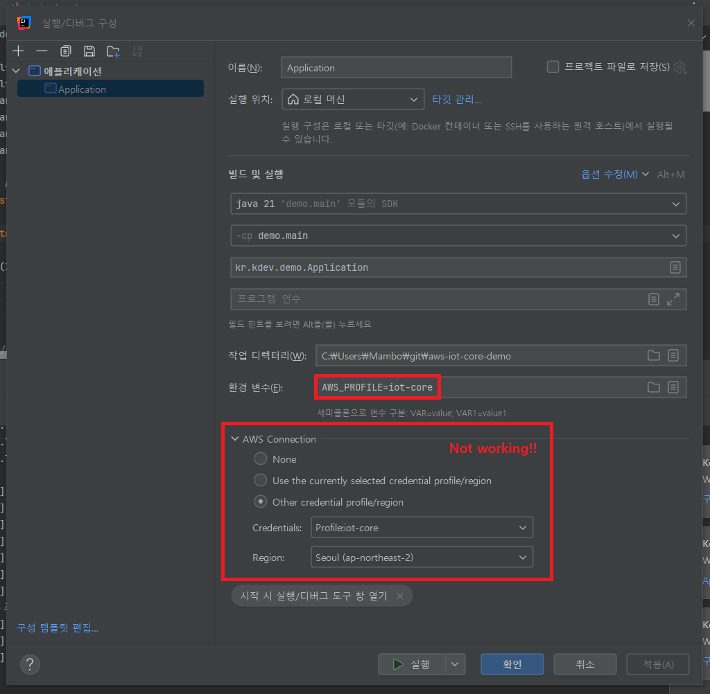๋ฆฌ์ ์ด์ Run Configuration ์์ ํ๊ฒฝ ๋ณ์์ AWS_PROFILE์ ์ค์ ํ๋ฉด iot-core