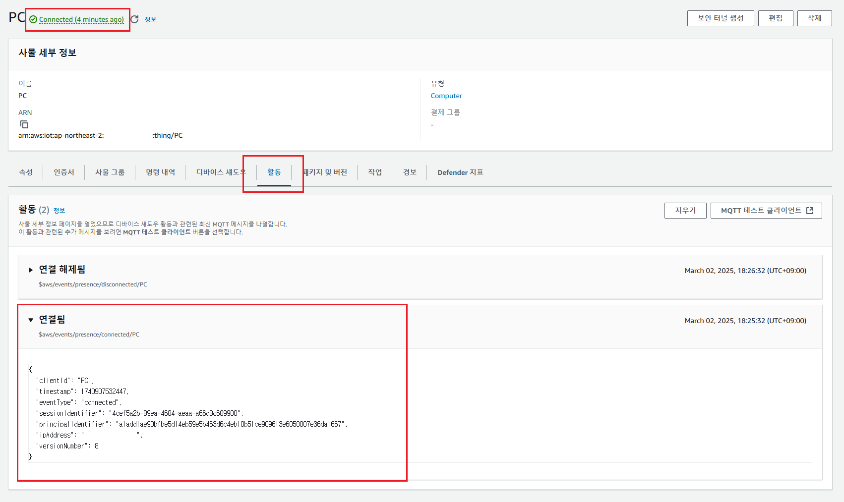 ํ๊ธฐ ์ํด์๋ MQTT ํด๋ผ์ด์ธํธ ์์ด๋๋ฅผ ์ฌ๋ฌผ ์ด๋ฆ๊ณผ ๋์ผํ๊ฒ ์ค์ ํด์ผ ํฉ๋๋ค. ์์, ๋ฉ์์ง ๋ธ๋ก์ปค ์ฐ๊ฒฐ ๊ถํ์์ ํด๋ผ์ด์ธํธ ์์ด๋๋ฅผ ์ฌ๋ฌผ ์ด๋ฆ ๊ทธ๋๋ก ์ฌ์ฉํด์ผํ๋ ์ด์ ๊ฐ ๋๊ธฐ๋ ํฉ๋๋ค. ์ฐ๊ฒฐ ์ํ์ ๋ํ ์์ธ ์ด์ ๋ ์น ์ฝ์์ ์ฌ๋ฌผ ์ฐ๊ฒฐ์ฑ API ํ