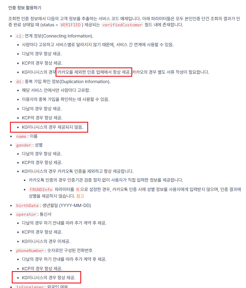 다만, KG이니시스 통합인증의 카카오톡 인증 시 CI 값을 받기 위해서는 별도 계약을 해야한다는 건 중요해요.