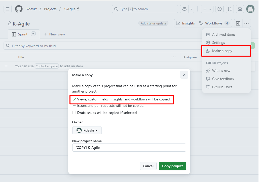 깃허브 프로젝트에서는 Make a copy 기능으로 프로젝트 복제를 지원합니다. Make a copy 로 프로젝트를 시작하면 현재 사용중인 레이아웃, 워크플로우와 같은 프로젝트 설정들을 템플릿처럼 적용하여 프로젝트를 시작할 수 있습니다. 조직이 관리해야할 제품이나 서비스가 많거나 다양한 정부 과제를 수행한다면 미리 프로젝트에 대한 설정을 템플릿으로 만들어두면 됩니다.
