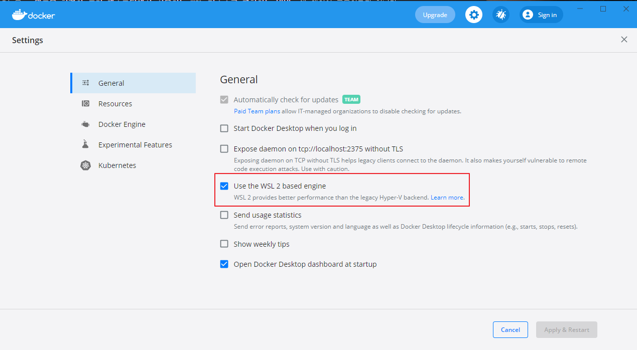 윈도우 10 환경에서 WSL 2를 설치하고 활성화했다면 도커 데스크탑에서 WSL 2를 사용해서 컨테이너를 구동될 수 있도록 지원하고 있습니다.