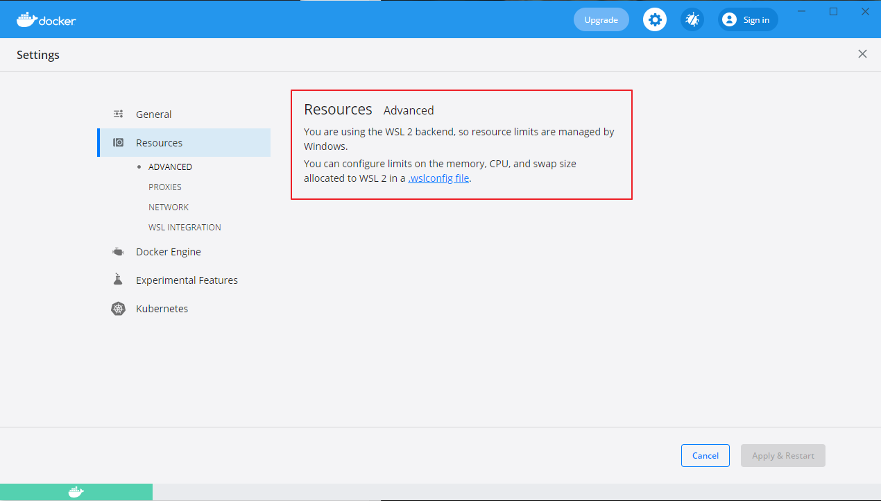 위에서 소개한 방법은 이미 도커 데스크탑에서도 설정 메뉴에서 소개하고 있는 부분으로 리소스 제한은 윈도우에 의해 관리되므로 CPU, 메모리 등을 제한하기 위해서는 WSL 2의 설정을 수행하라고 합니다.