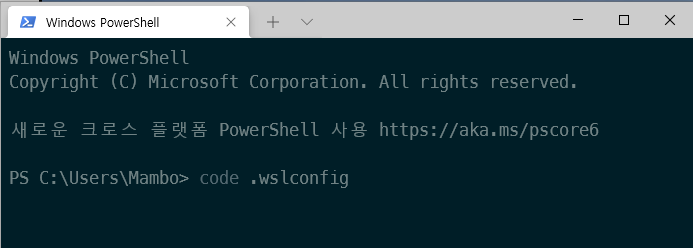 사용자 폴더 위치에서 .wslconfig 파일을 직접 생성하거나 다음과 같이 윈도우 터미널에서 비쥬얼 스튜디오 코드를 사용하여 생성할 수 있습니다.