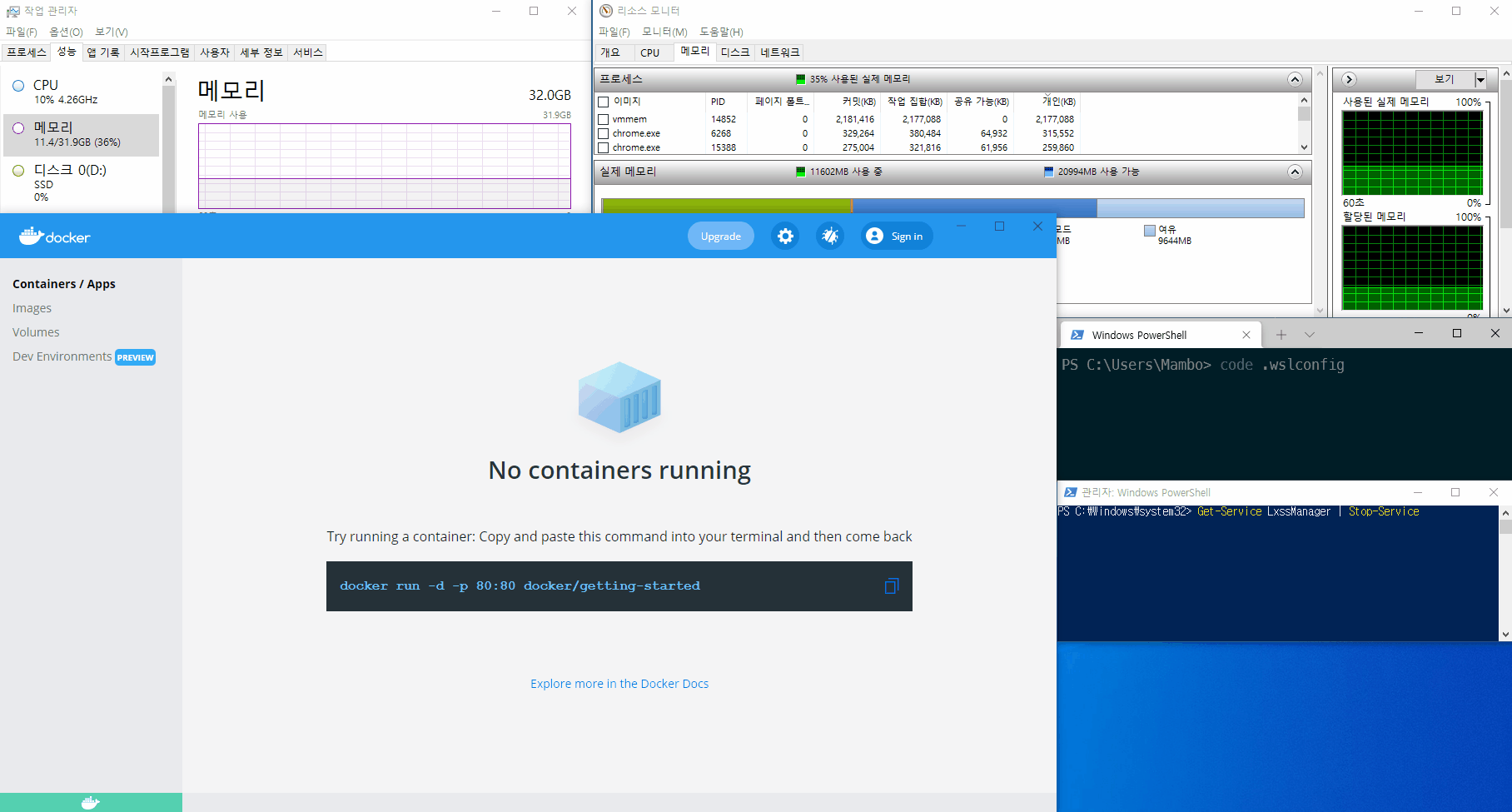 오늘은 윈도우 환경의 도커 데스크탑에서 사용하는 WSL 리소스를 제한하는 방법에 대하여 공유하고자 합니다. 윈도우에서 도커 데스크탑을 사용할 때 컴퓨터가 느려진다는 느낌을 받고있다면 현재 도커 데스크탑과 WSL에 의해 점유되는 메모리를 확인하시고 이 글에서 소개하는 방법으로 WSL가 점유하는 리소스를 제한하시는게 좋습니다.
