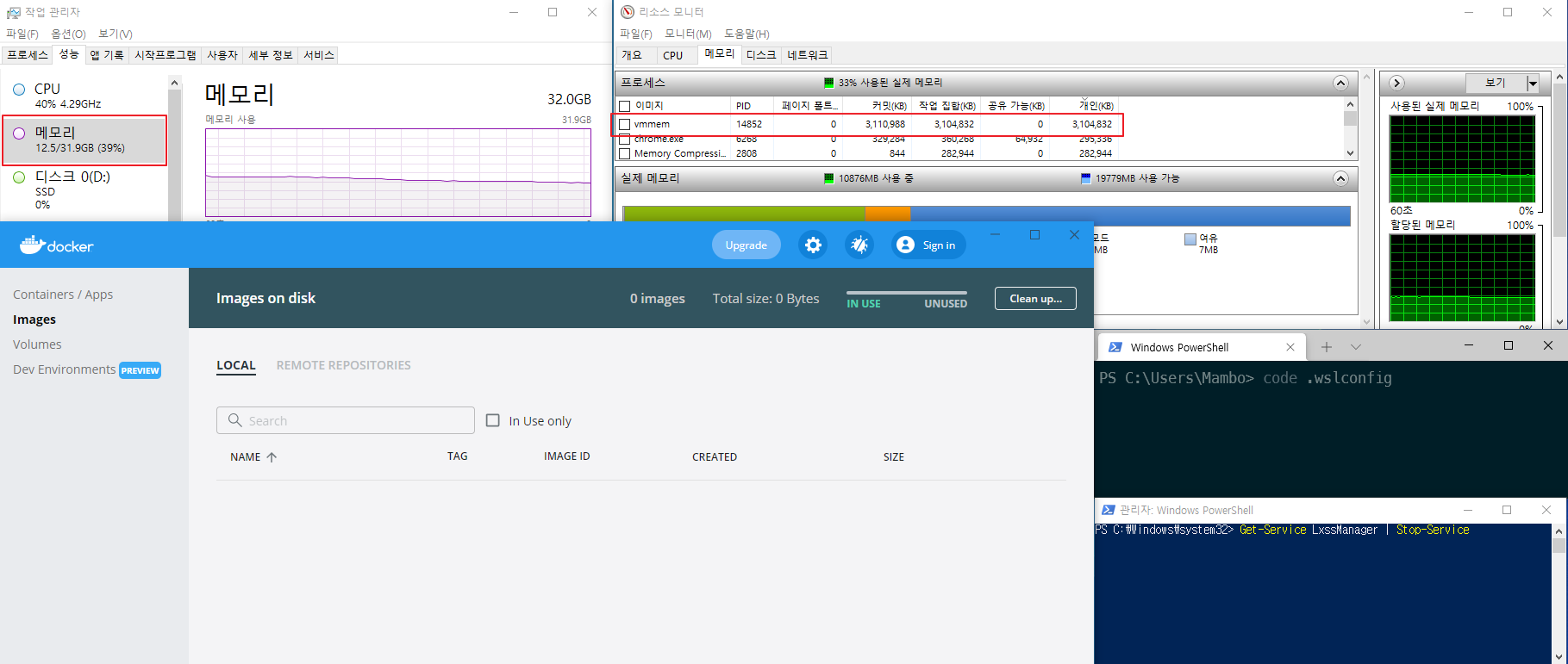 위 화면을 살펴보시면 도커 데스크탑으로 실행했던 컨테이너를 전부 종료하고 이미지 그리고 볼륨을 전부 삭제했음에도 불구하고 WSL2에서 점유중인 메모리의 일부는 반환되지 않고 있음을 보여줍니다.