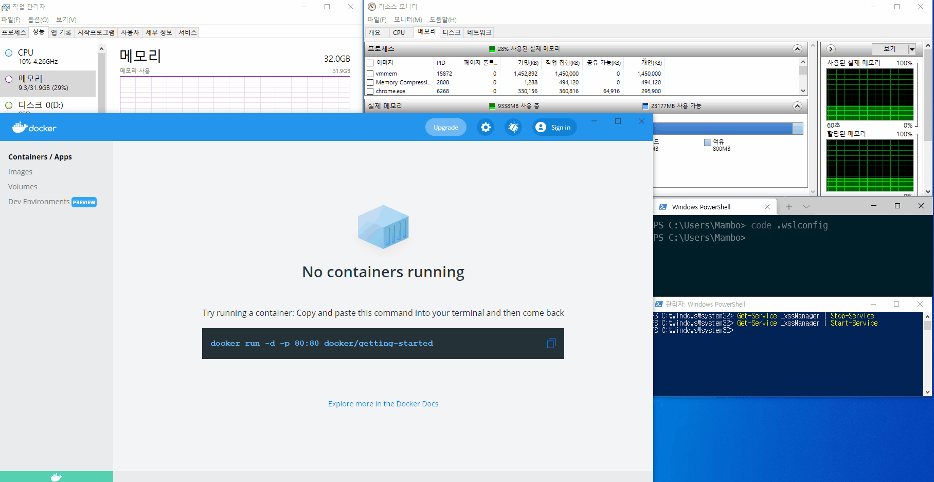 이제 WSL 2에서 점유하여 사용할 프로세서를 2개, 메모리를 2GB 그리고 스왑을 하지않도록 설정하고 앞서 컨테이너를 실행했던 것을 다시 시도 해본 결과를 확인해보겠습니다.