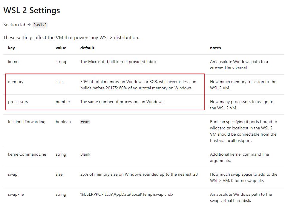 기본적으로 프로세서는 전부 사용한다고 하며 메모리는 총 메모리의 절반 또는 8GB 중 작은쪽으로 설정됩니다. 저의 경우는 32GB의 메모리이므로 메모리의 절반보다 작은 8GB가 설정되게 됩니다. 일반적으로 개발자가 사용하는 컴퓨터의 메모리 용량 16GB이라면 동일하게 8GB이므로 무려 총 메모리의 절반이나 점유할 수 있게 되고 컨테이너를 종료하더라도 일부의 메모리는 점유하고 있을 수 있다는 이야기입니다.