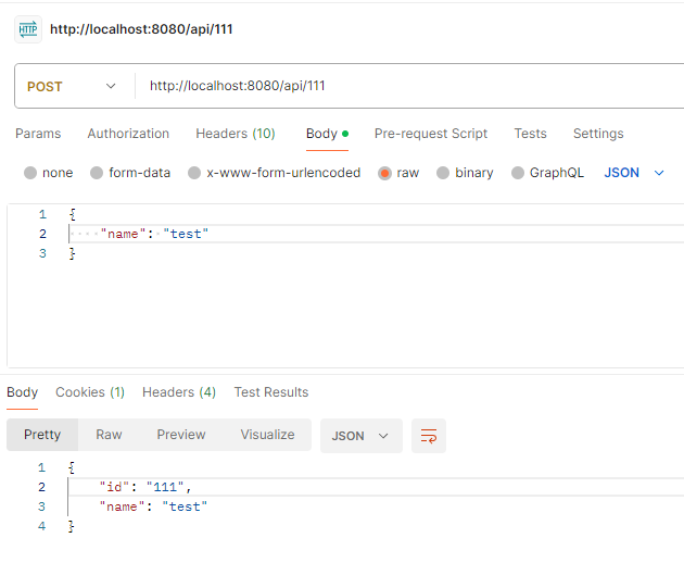 클래스를 이용하였다. 자바에서 대부분의 오브젝트 필드에는 private 접근 제어자를 선언하므로 접근할 수 있도록 한 이후에 필드에 값이 없는 경우에 한해서만 PathVariable에 대한 값을 바인딩하였다. 결과적으로 아래의 이미지와 같이 요청 데이터에 아이디가 포함되지 않아도 PathVariable에 해당되는 111 값이 포함됨을 알 수 있다.