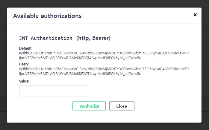 이 표시되는 걸 확인할 수 있다. 인증 방법에 대한 설명을 제공하는 부분이지만 일반 텍스트 뿐만 아니라 HTML 태그가 가능한 것으로 보인다. 본 글에서는 이것을 이용해서 개발 환경에서는 테스트 사용자에 대한 이름과 토큰이 표시될 수 있도록 할 예정이다.