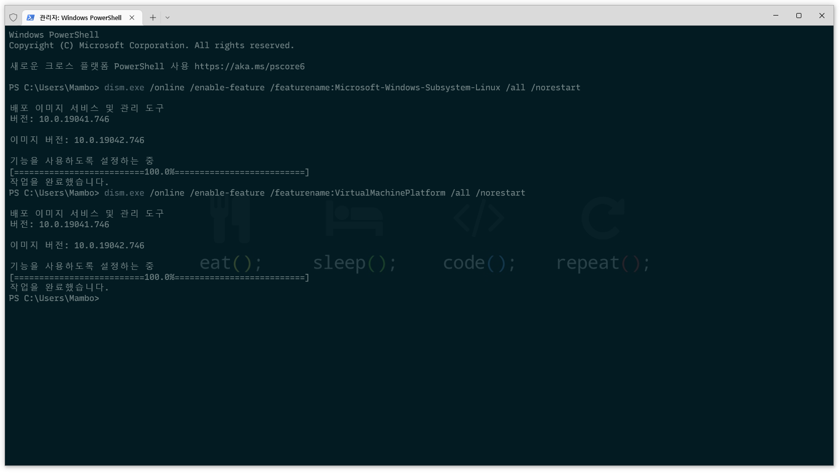 위 명령어를 수행하여 WSL 기능을 활성화했다면 WSL2 리눅스 커널을 다운로드하여 설치한 후 관리자 권한의 윈도우 터미널을 열고 WSL2 버전을 선택하면 끝입니다.