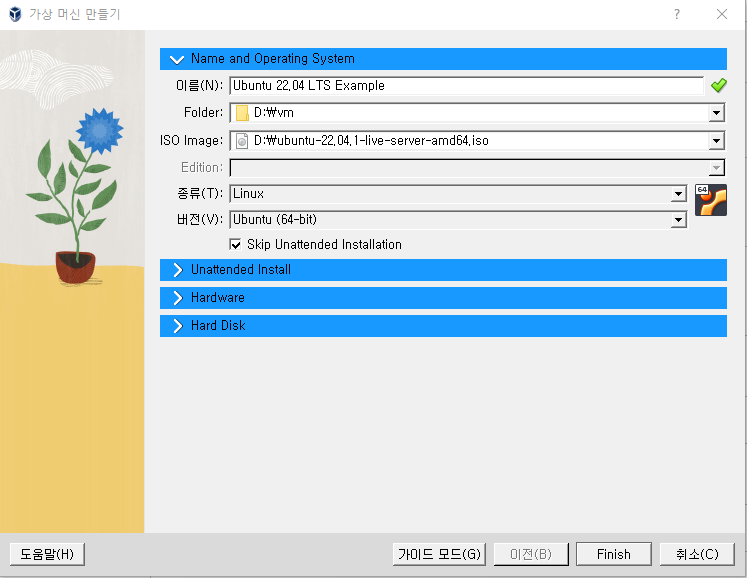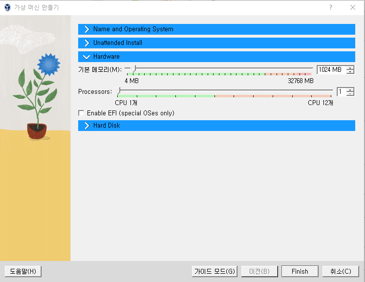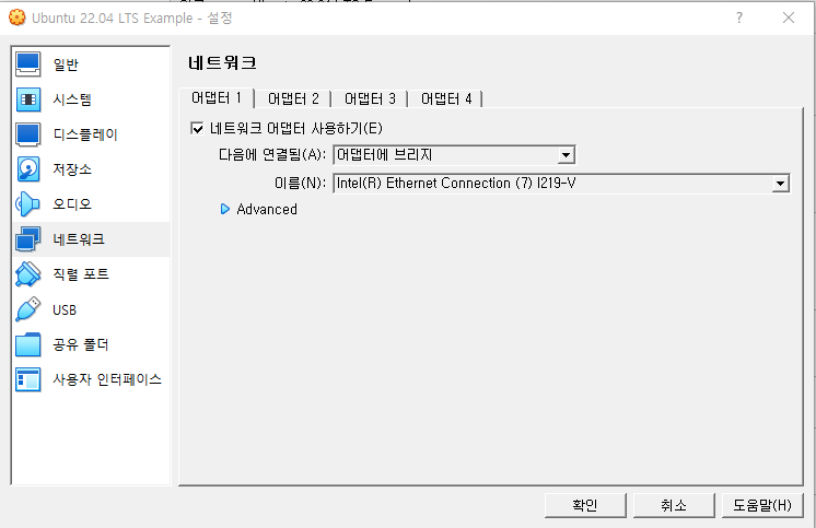 우분투 리눅스를 실행하기 위한 가상 머신은 최소한 메모리 1GB, 디스크 볼륨 30GB 로 선택하는 것을 추천하는데 이는 AWS 클라우드 서비스에서 제공하는 프리티어 사양과 동일하기 때문입니다. 또한 공유기를 사용하여 로컬 아이피를 할당받아 컴퓨터를 사용하고 있다면 네트워크 유형을 NAT가 아닌 호스트 어댑터로 변경하여 공유기에서 별도의 IP를 할당받도록 하는게 좋습니다.